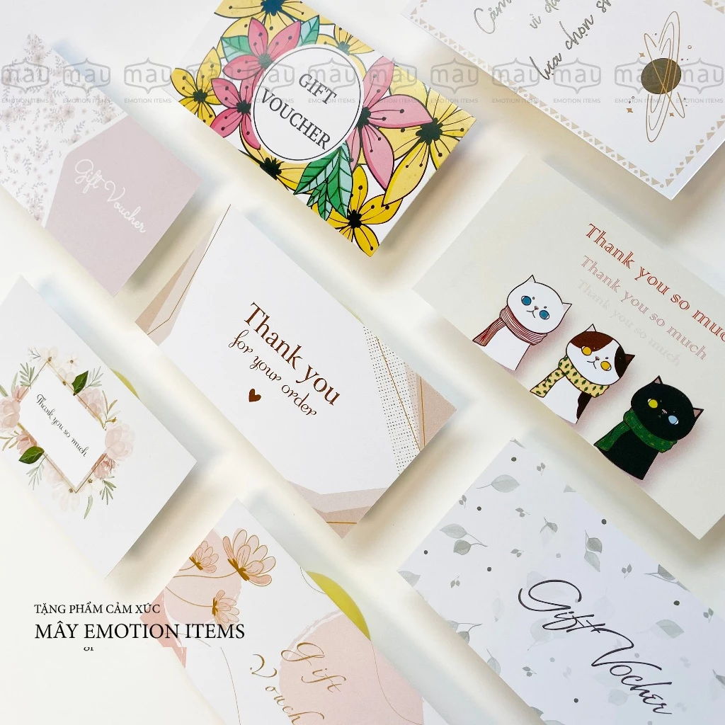 Một sản phẩm mà bạn có thể cân nhắc sử dụng là SET 50 chiếc Thiệp cảm ơn khách hàng, voucher giảm giá, card thank you tag treo thank you in sẵn 5*10cm. Sản phẩm này bao gồm: