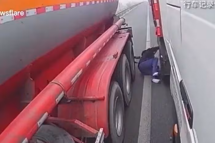 Trong khi tài xế đang làm việc dưới gầm xe, các phương tiện khác vẫn di chuyển với tốc độ cao. Chỉ sau vài giây, một xe bồn tải hàng nặng chạy từ làn ngoài cùng bên phải lao tới. Khi tài xế vừa chui ra khỏi gầm xe, xe bồn đã va chạm mạnh, đẩy anh ngã xuống mặt đường và gần như bị bánh xe cán qua.