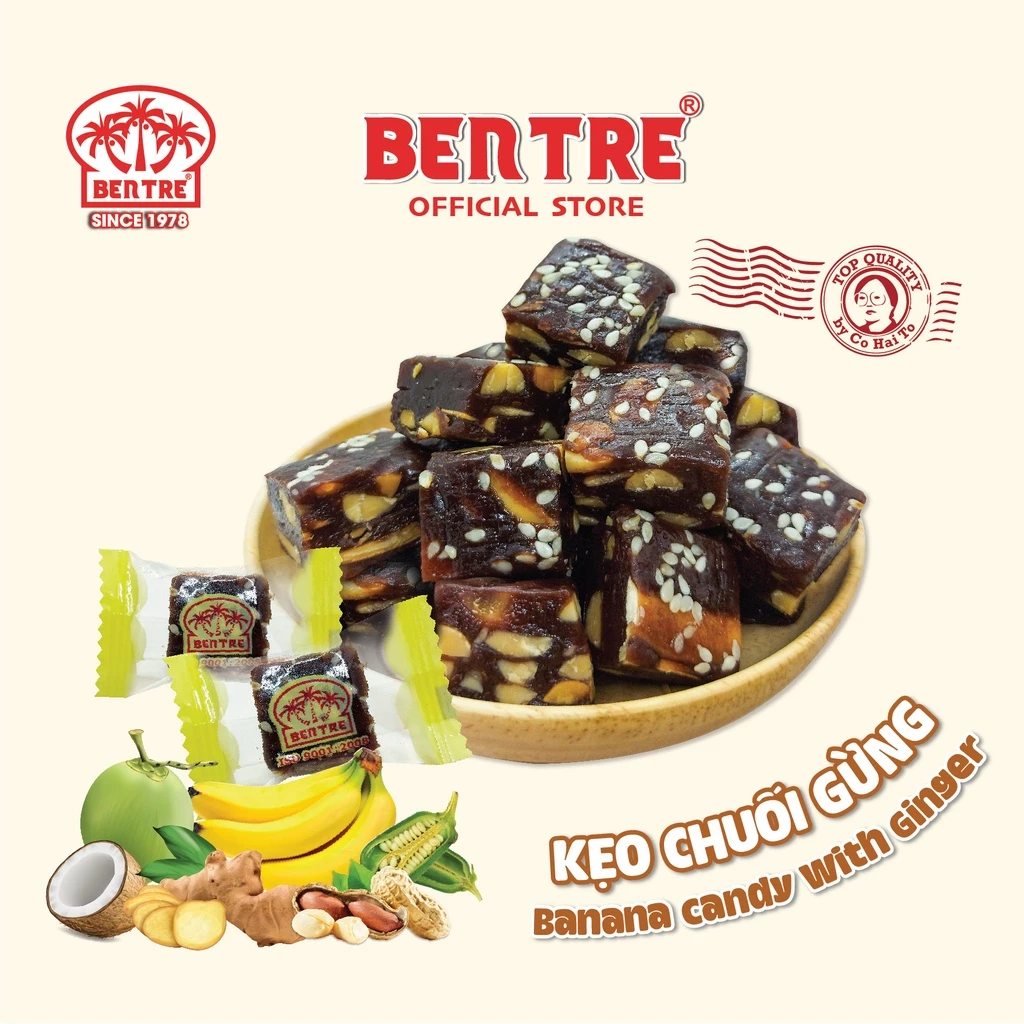 Kẹo chuối gừng đậu mè Bến Tre mang thương hiệu của một trong những vùng đất nổi tiếng với nghề làm kẹo truyền thống. Sản phẩm được sản xuất theo phương pháp truyền thống, kết hợp với quy trình kiểm soát chất lượng nghiêm ngặt để đảm bảo hương vị và chất lượng.